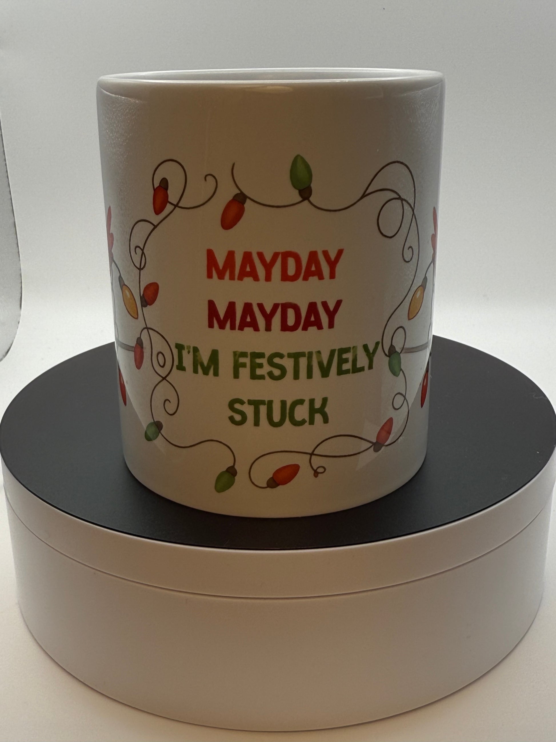 On the front, the playful message “MAYDAY MAYDAY I’M FESTIVELY STUCK” adds a hilarious touch that’s guaranteed to make anyone smile while they sip their morning coffee, hot chocolate, or holiday latte.